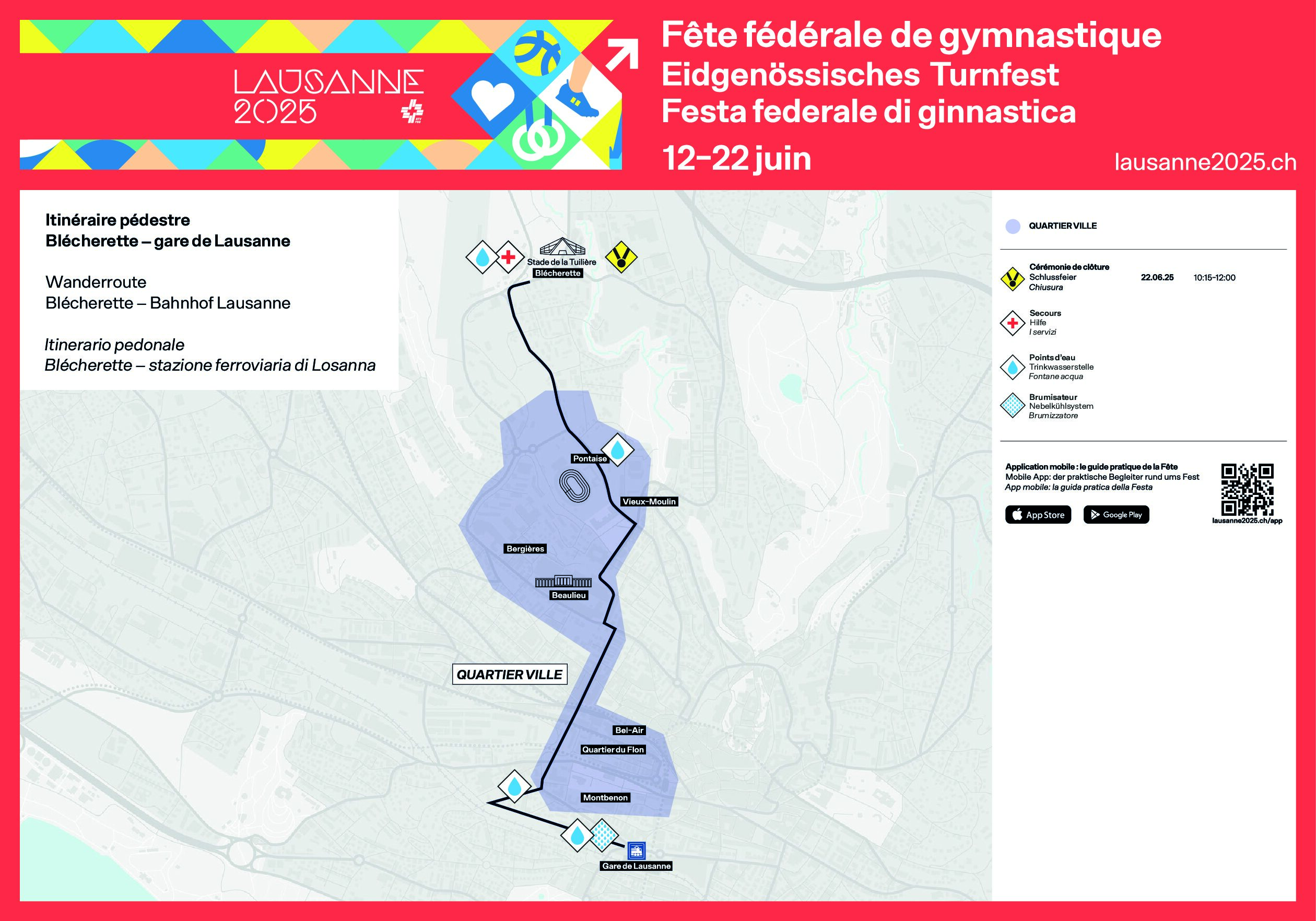 En cas de besoin, des points d’aides médicales sont disponibles au Stade de la Tuilière, sur l’itinéraire de déplacement et sur la zone d’attente Plateforme 10.