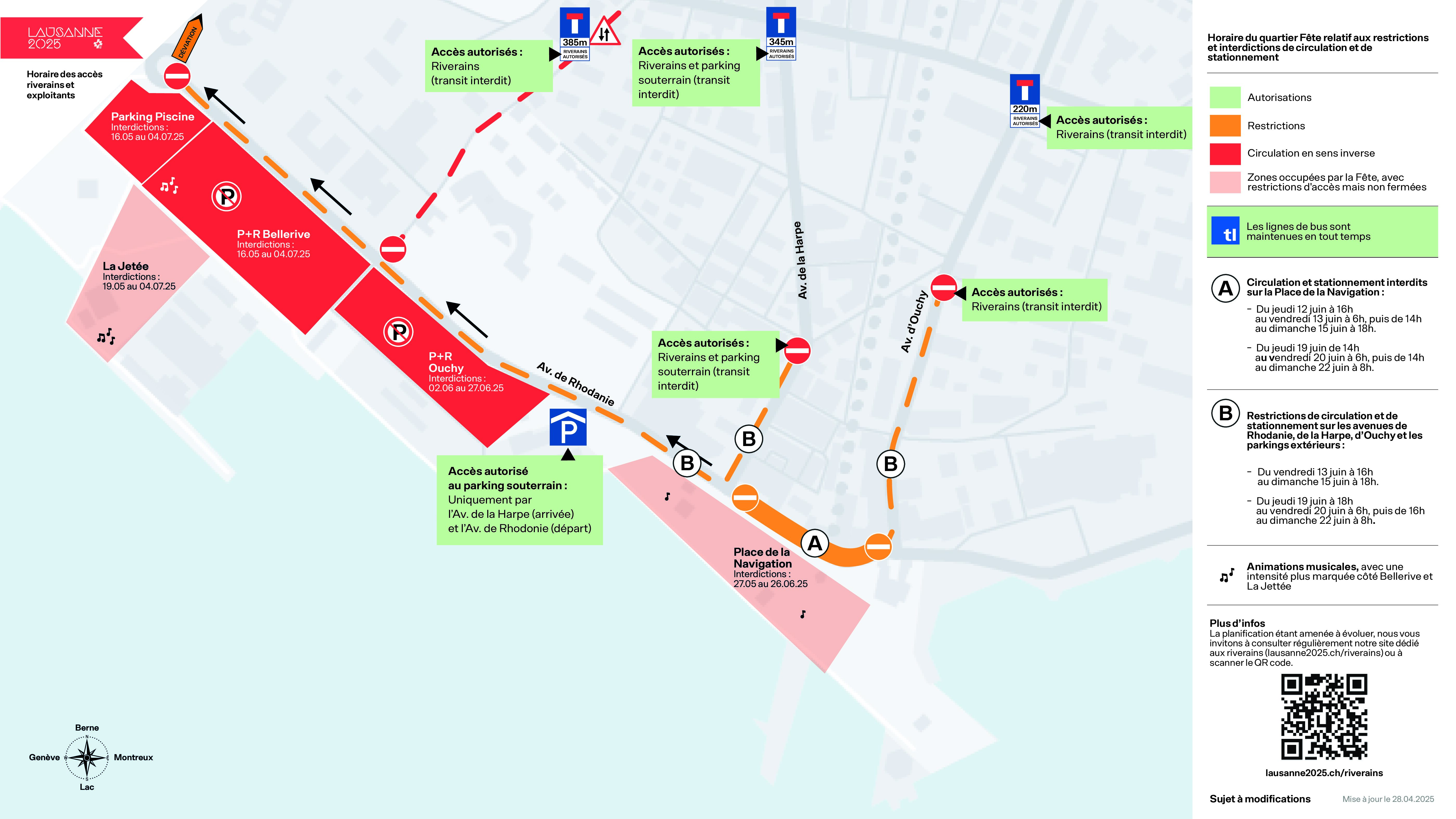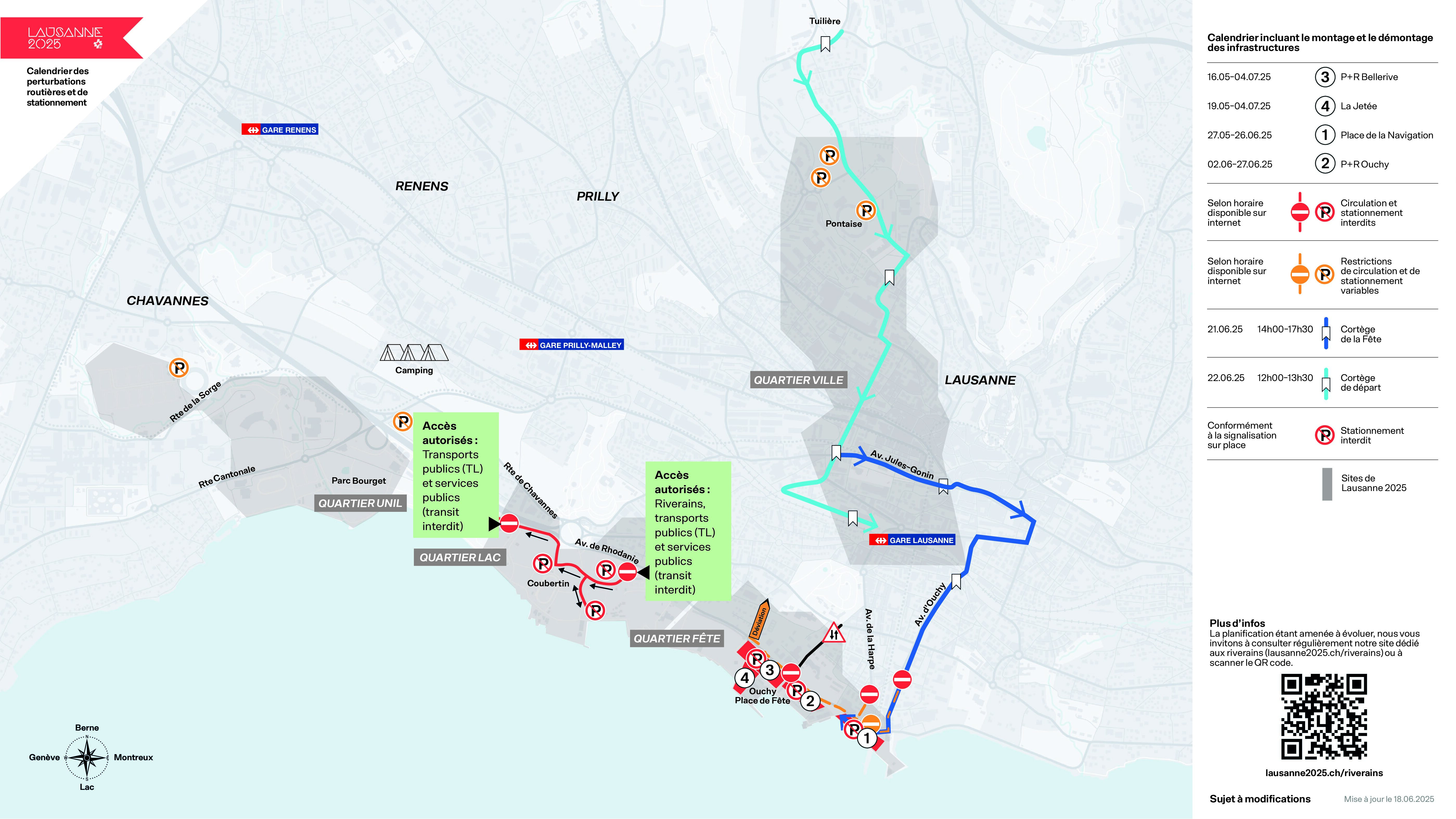 Pour garantir le bon déroulement de la manifestation, des restrictions de circulation, fermetures de routes et modifications d’accès aux parkings seront mises en place autour de la Place de la Navigation, les avenues de Rhodanie, de la Harpe, d’Ouchy et les parkings extérieurs. Retrouvez ici toutes les informations mises à jour régulièrement pour limiter l’impact sur votre quotidien. Merci pour votre compréhension et votre collaboration.